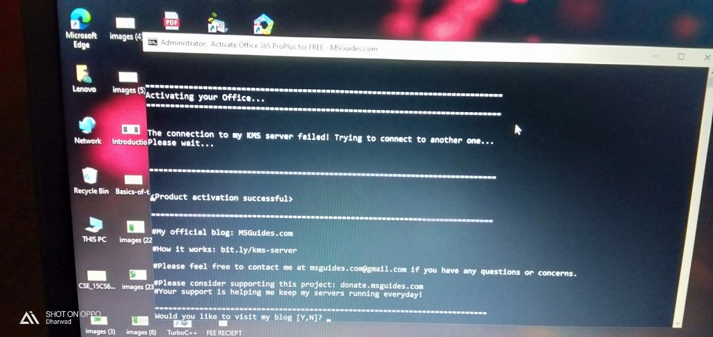 cscript //nologo ospp.vbs /act | find /i "successful" && (echo.&echo ============================================================================&echo.&echo #My official blog: MSGuides.com&echo.&echo #How it works: bit.ly/kms-server&echo.&echo #Please feel free to contact me at msguides.com@gmail.com if you have any questions or concerns.&echo.&echo #Please consider supporting this project: donate.msguides.com&echo #Your support is helping me keep my servers running everyday!&echo.&echo ============================================================================&choice /n /c YN /m "Would you like to visit my blog [Y,N]?" & if errorlevel 2 exit) || (echo The connection to my KMS server failed! Trying to connect to another one... & echo Please wait... & echo. & echo. & set /a i+=1 & goto server)